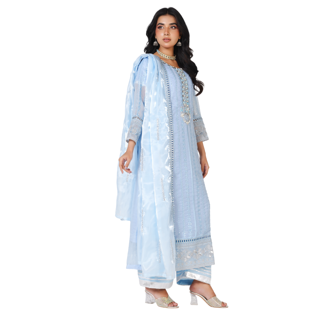 Premium Sheesha Silk Stitched 3-Piece Party Wear Suit – Hand-Embellished Mirror Work Collection